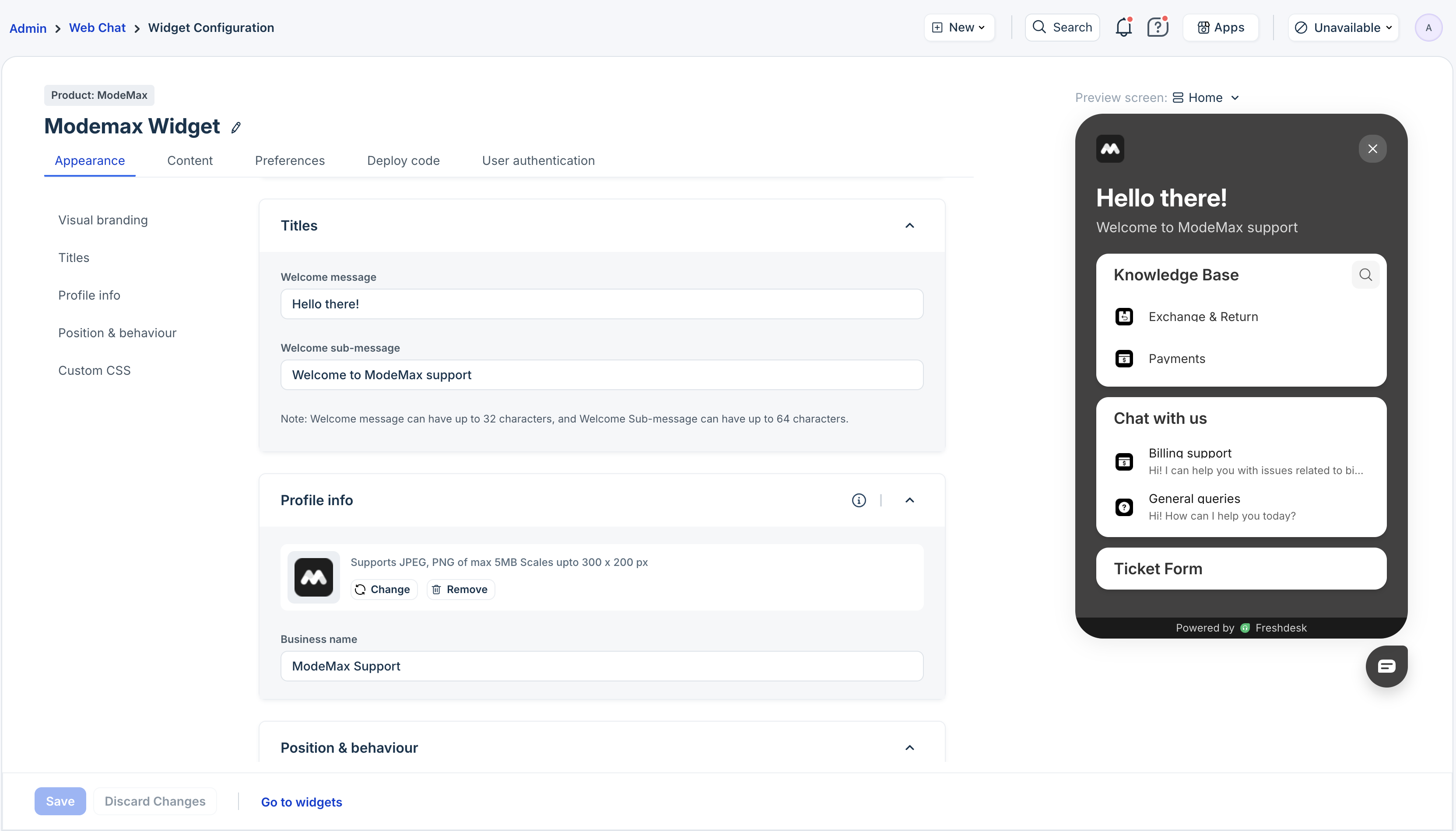 The chat interface embedded on your website or portal acts as your central point of customer engagement. You can create multiple widgets for different websites, products, or regions, and customize each widget to match your brand. The widget can include: