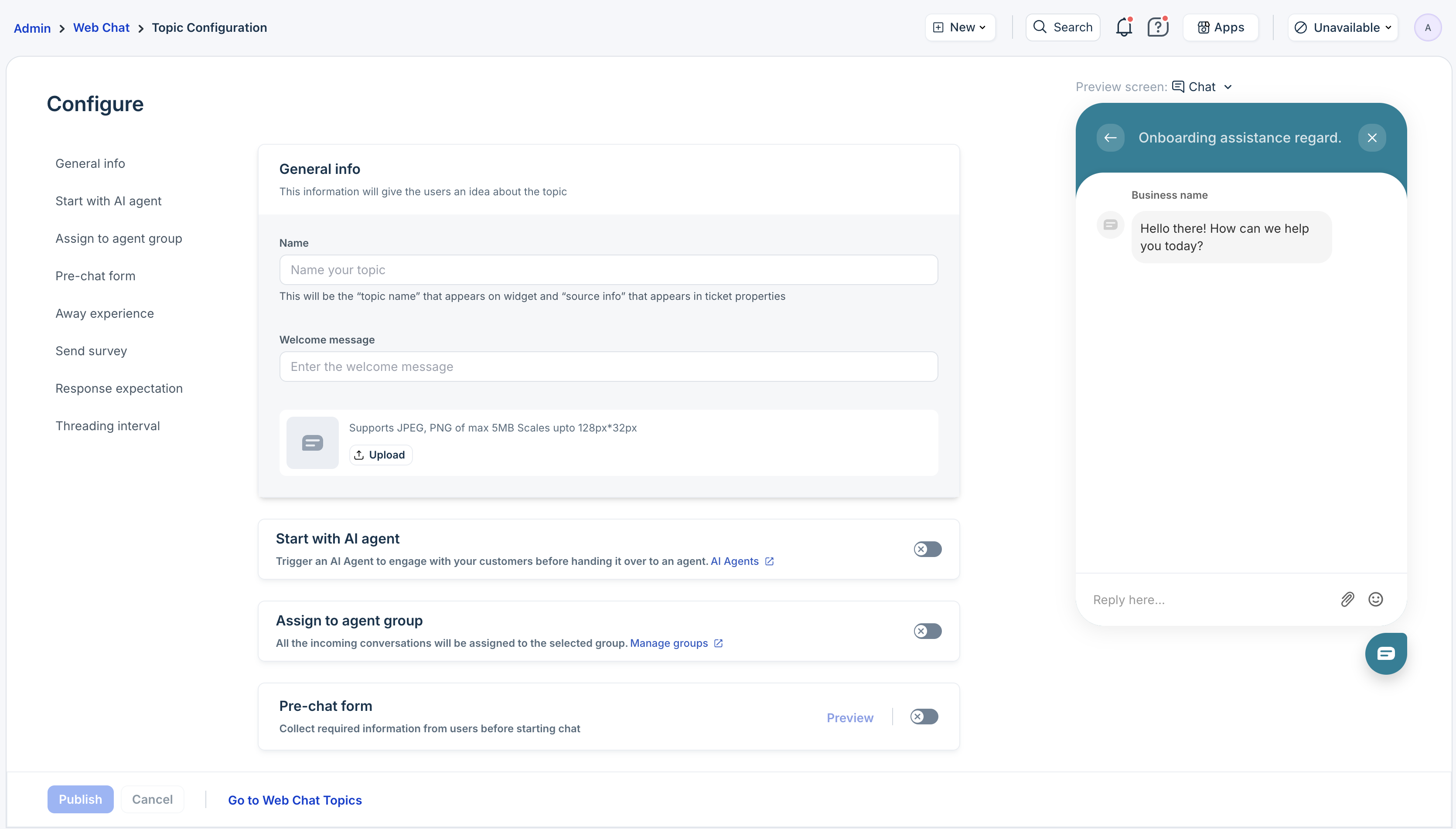 Enable customers to connect with either an AI Agent or a human agent. The live chat configuration is done via the Web Chat topics. You can create multiple Web Chat topics and customize each one to match different customer needs and scenarios. For every topic, you can map AI Agents, route chats to specific agent groups, define after-office hours behavior, trigger surveys, and more, ensuring a tailored and seamless live chat experience.