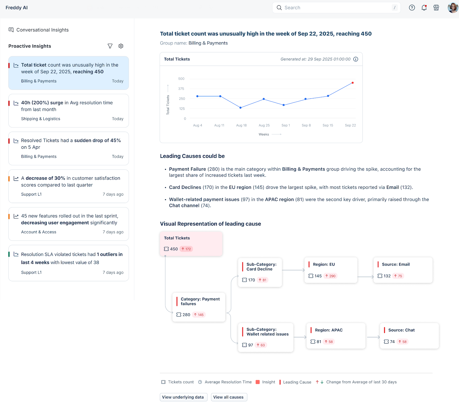 Whenever a user accesses the Freddy AI module in Freshdesk, they will see a list of all the insights that are proactively generated. These insights are user-role-based; therefore, only relevant insights will be shown to each user.
