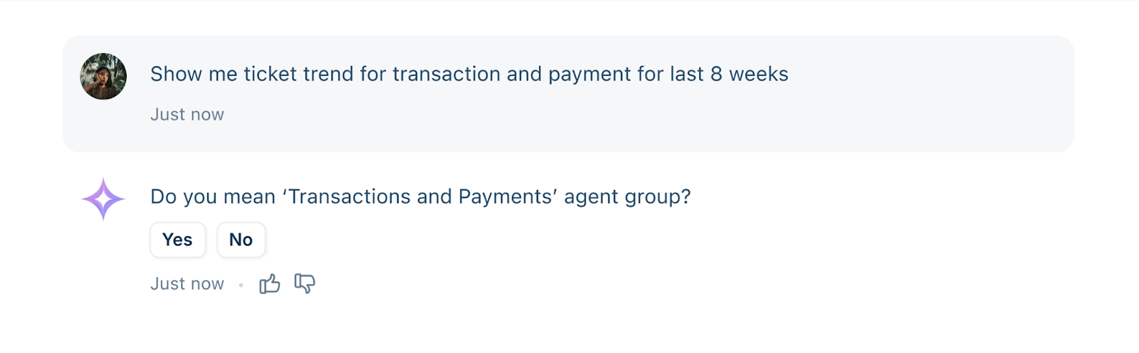 Note:For the most accurate results in Conversational Insights: 1) Avoid asking questions that are irrelevant to analytics, ambiguous, or overly complex with multiple conditions. 2) For complex queries, break them into simpler questions and use follow-up queries. 3) The feature supports only English and cannot answer questions about data outside Freshdesk.