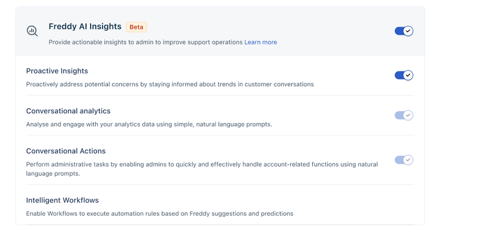 Conversational Insights is available as a part of the Freddy AI Insights feature and becomes accessible when Freddy AI Insights is enabled. If you are a Freshdesk Enterprise customer and Freddy AI Insights is not enabled for your account, perform the following steps to enable Freddy AI Insights: