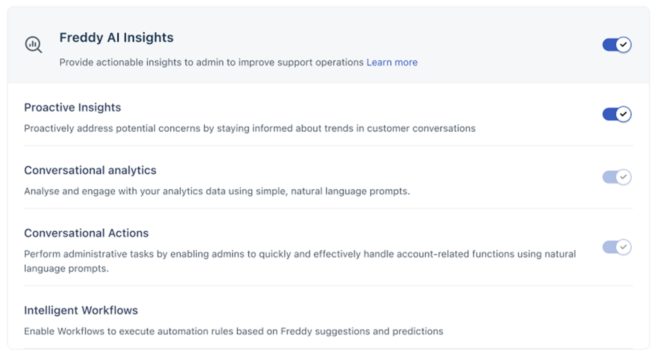 • New Activations: For eligible accounts enabling Freddy AI Insights after June 1, 2026, the Conversational Insights feature will be provisioned and accessible within 24 hours of enablement.