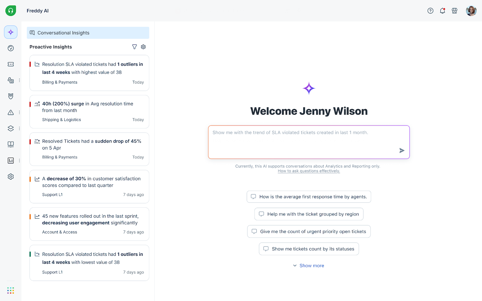 • Pre-enabled Accounts: Customers who have already enabled Freddy AI Insights will receive automatic access to the Conversational Insights on June 1, 2026.