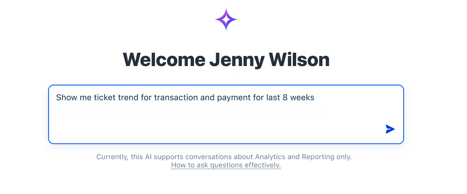 2. Type your question in the input box using natural language. For example, "Show me the ticket trend for transactions and payments for the last 8 weeks." The Prompts section also has a list of predefined most-used prompts that you can use.