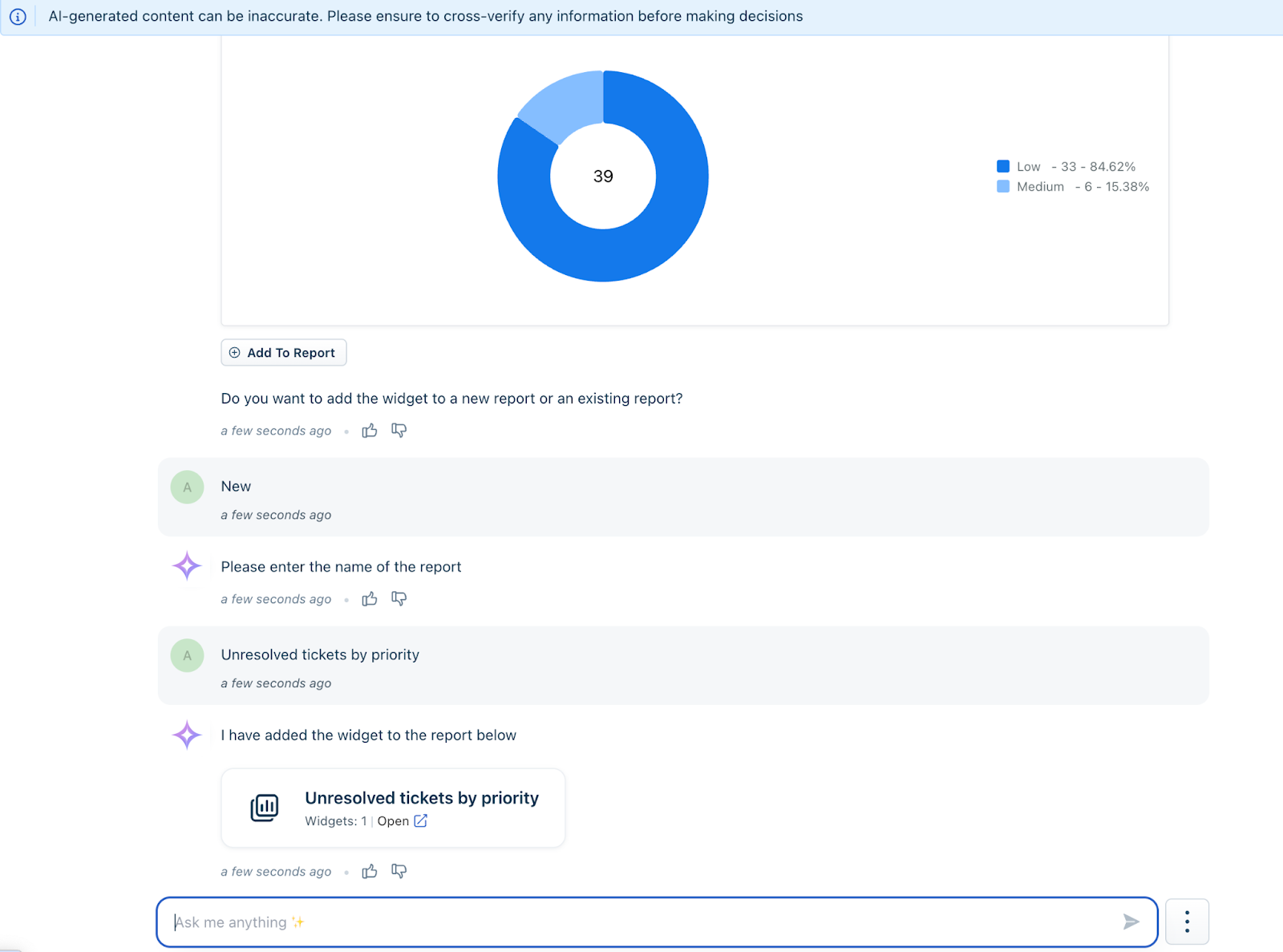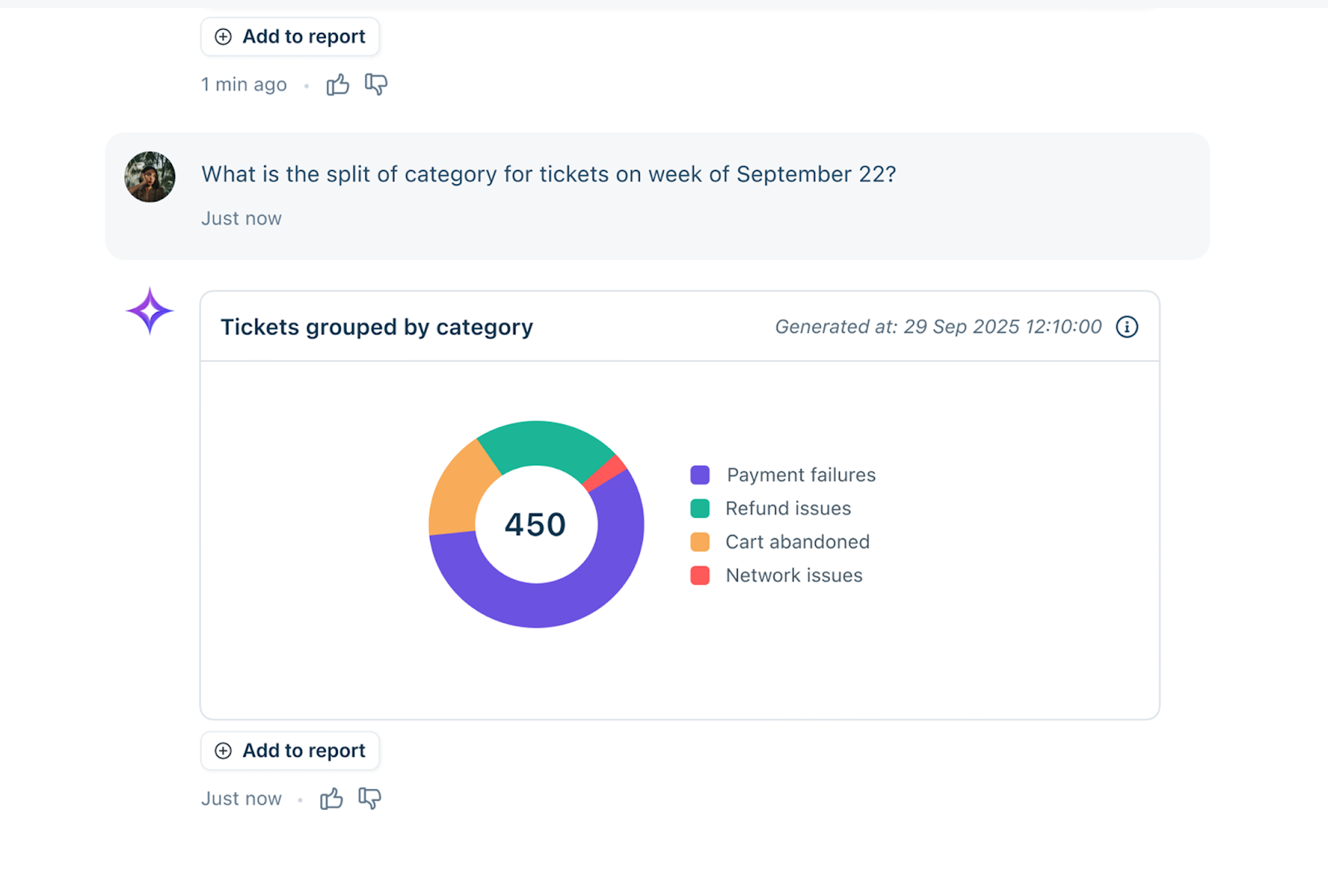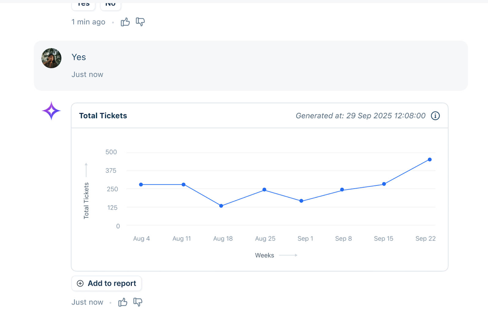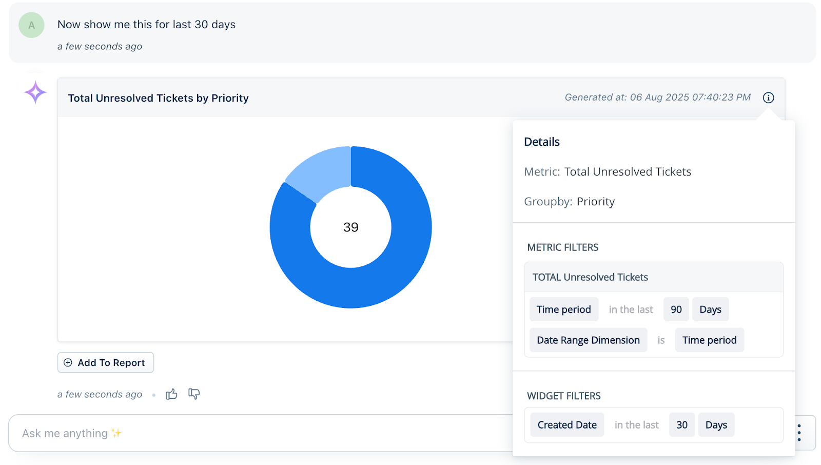Conversational Insights, powered by Freddy AI, allows you to explore your Freshdesk data using natural language queries. The feature supports multi-turn conversations, allowing you to refine queries and drill deeper into trends, performance metrics, and operational insights. Generated charts can be directly added to Analytics reports, helping you build dashboards faster and more efficiently.
