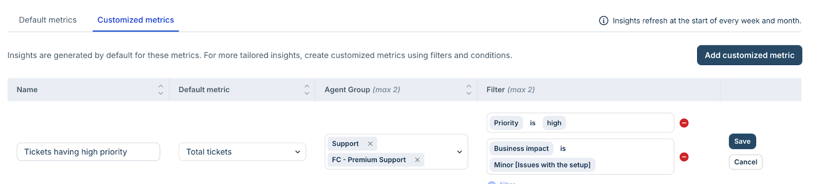 Customized Insights let you create additional metrics on top of Freddy AI’s default Proactive Insights. Each metric includes: