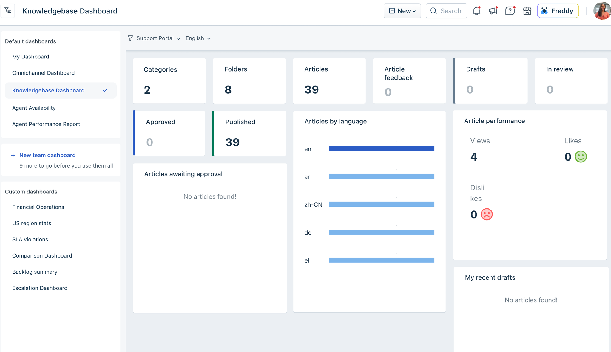 The Knowledge Base dashboard gives you a quick snapshot of the following information: