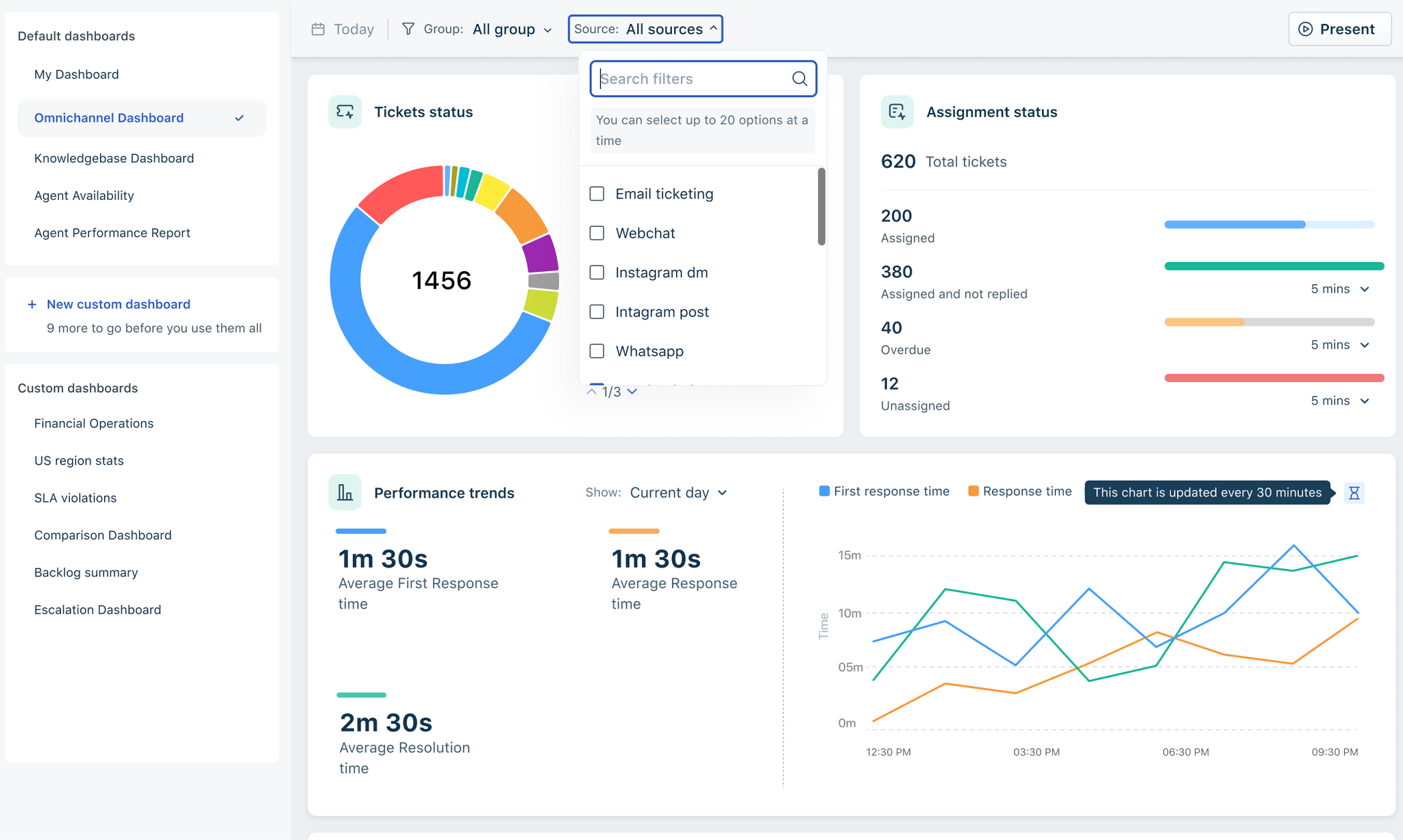 - Performance Trends – Displays Average first response, response, and resolution times. You can filter by Current day, last 15, 30 minutes, and 1 and 4 hours.