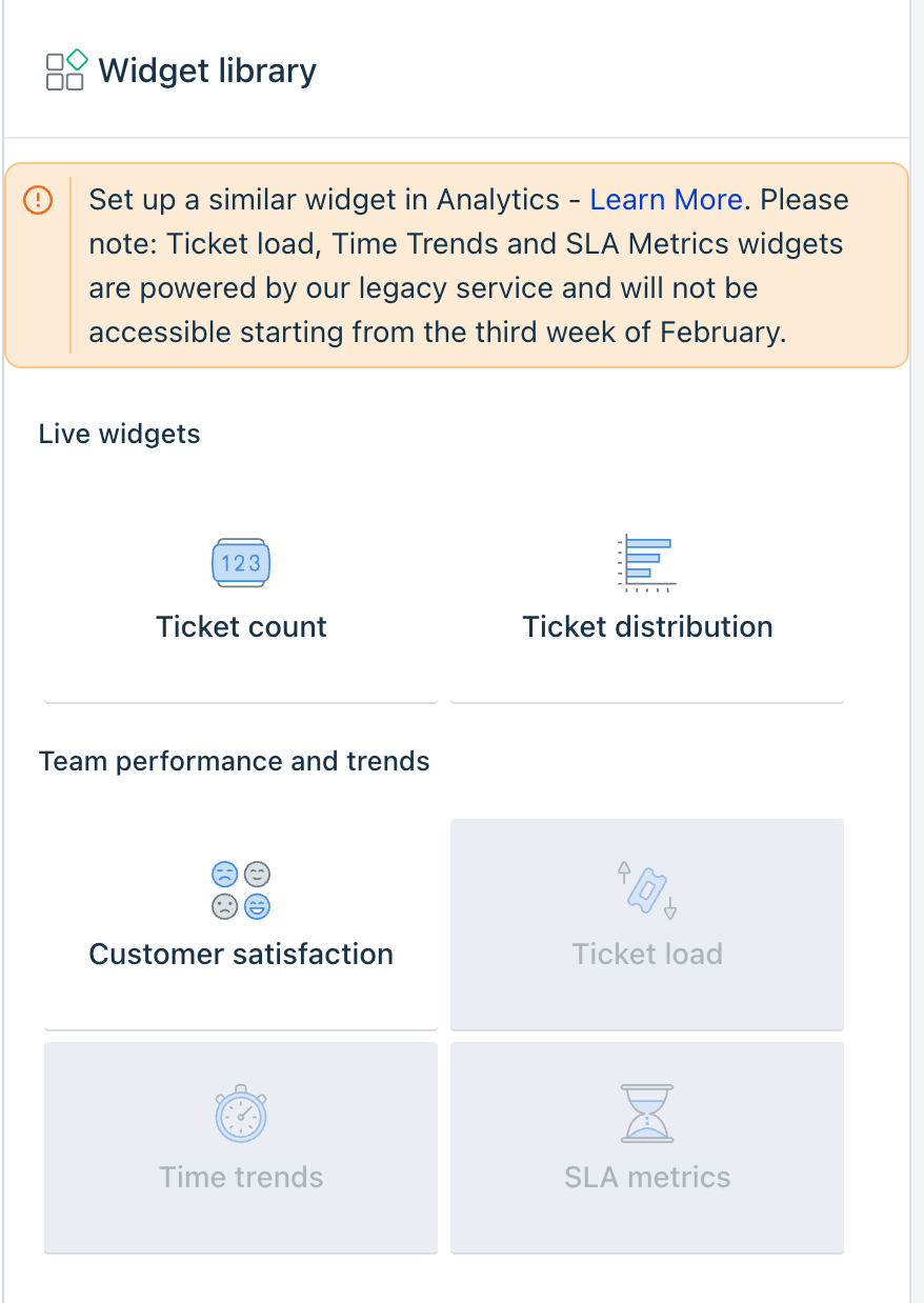 - Unassigned - Displays the number of unassigned tickets. Can be filtered for the next 5, 15, 30 mins, and 1 and 4 hours)