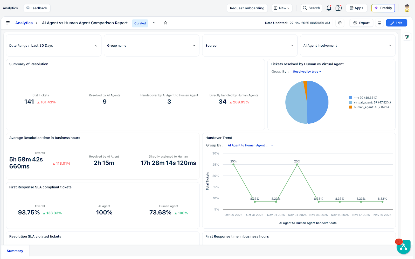 AI agents and human agents often collaborate to resolve customer conversations, but they do so in distinctly different ways. To understand how each contributes, for instance, where AI speeds things up, where humans add depth, and how they complement each other, you need clear, comparable performance data. This section gives you that visibility by breaking down response times, handovers, and resolution patterns across both AI and human handling.