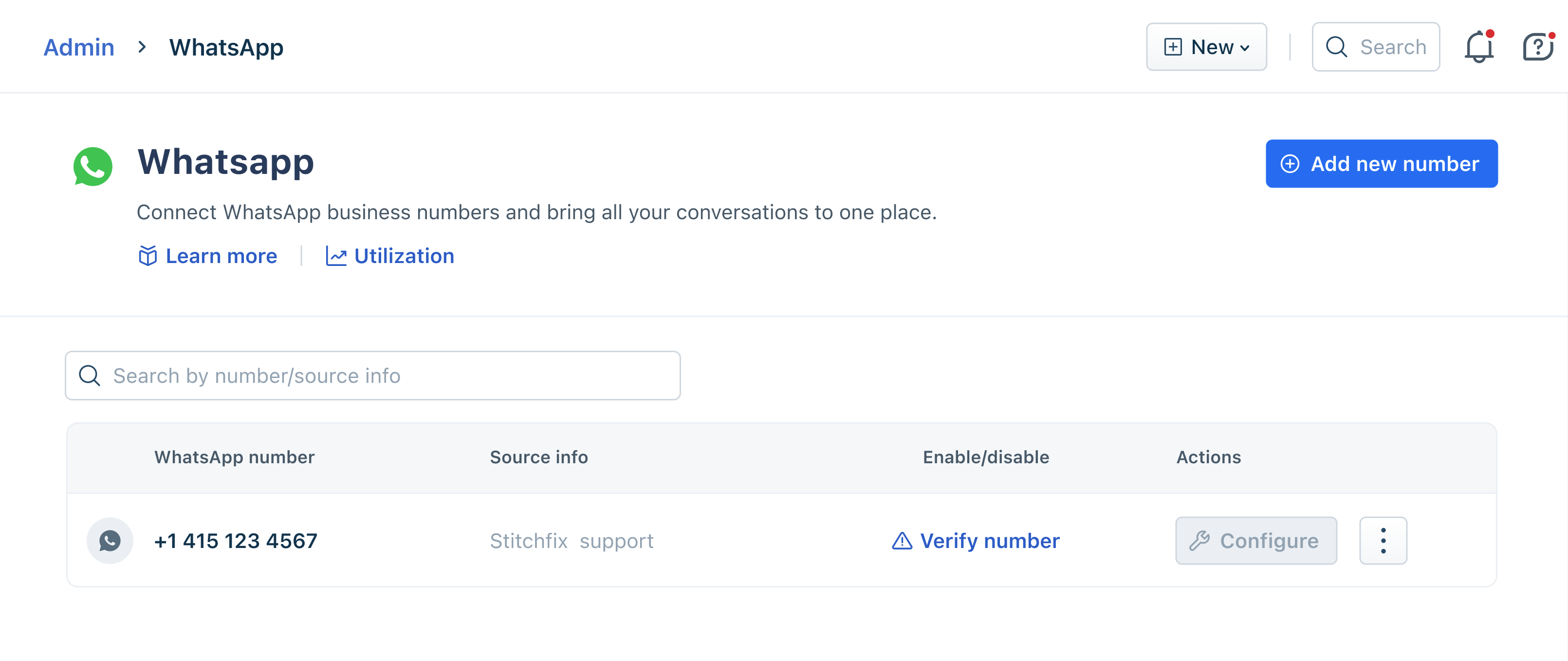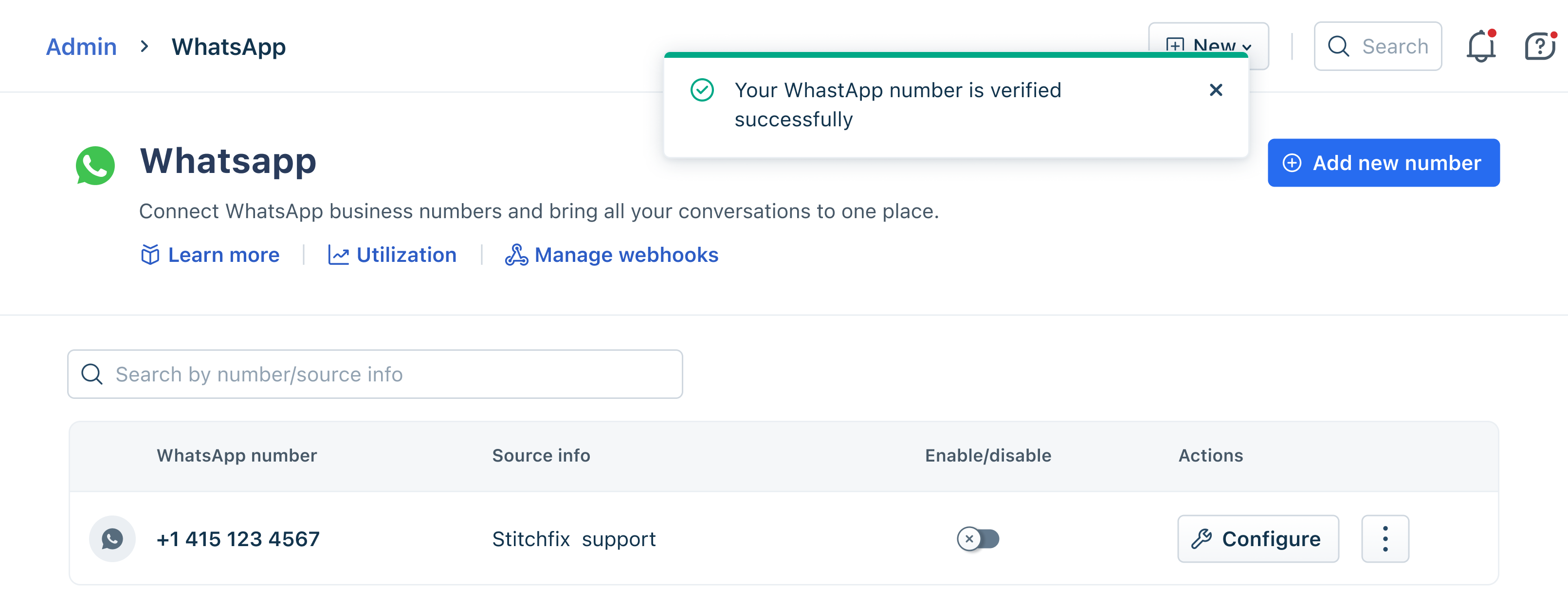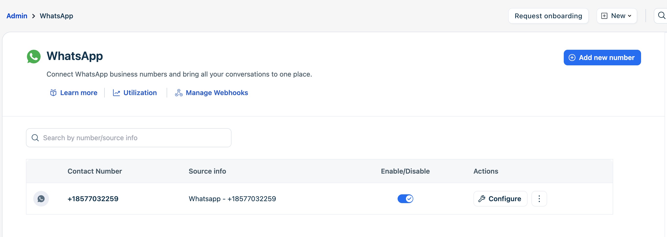 Enable the number to start supporting customers on the migrated WhatsApp number. You can configure additional settings for your number, such as setting up self-service via AI Agents or routing customer to specific agents. For details, see Configure Additional Settings for WhatsApp number.