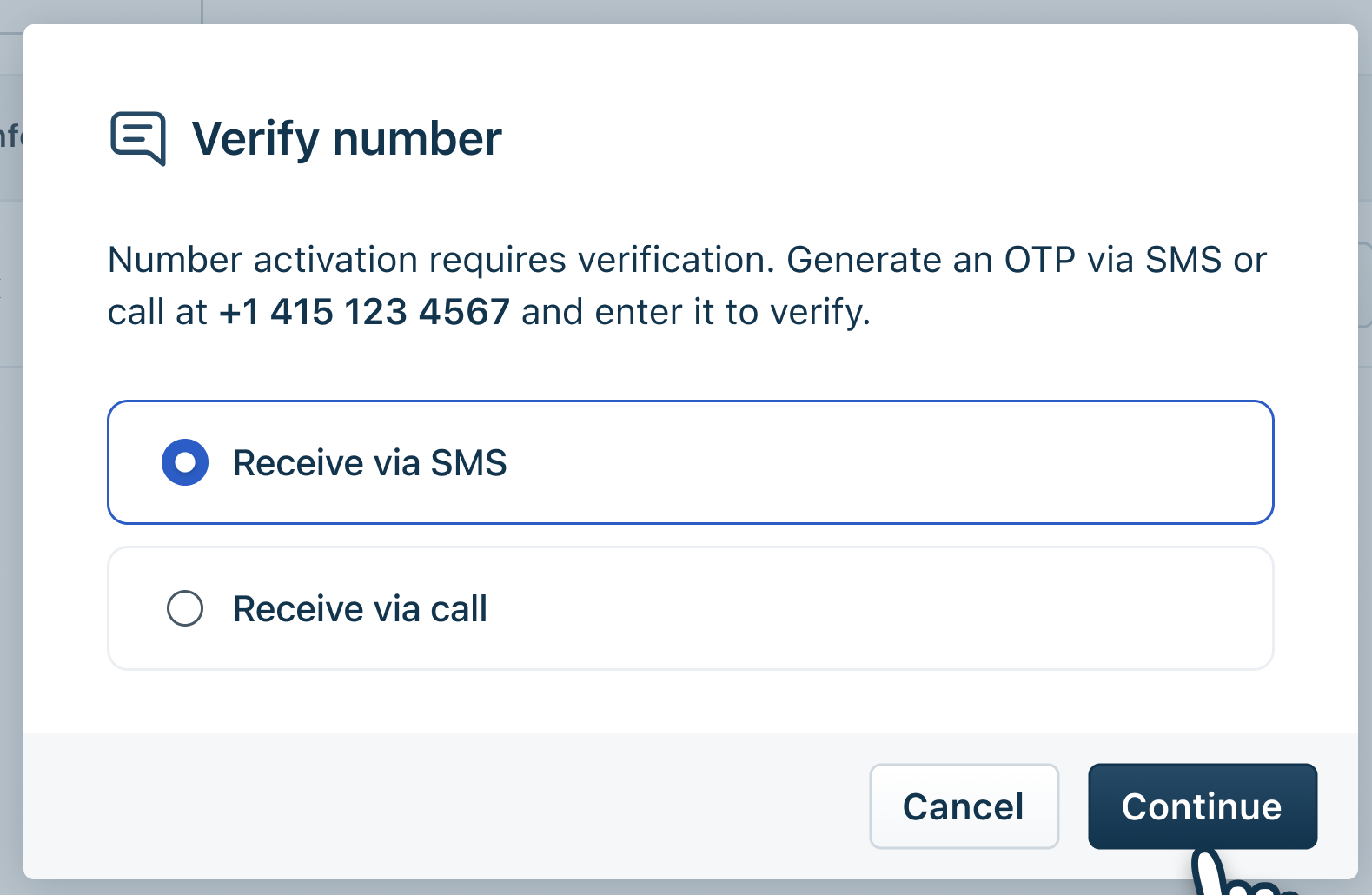 - Click Verify number and select how you want to authenticate the number. You can choose to receive SMS or call.
