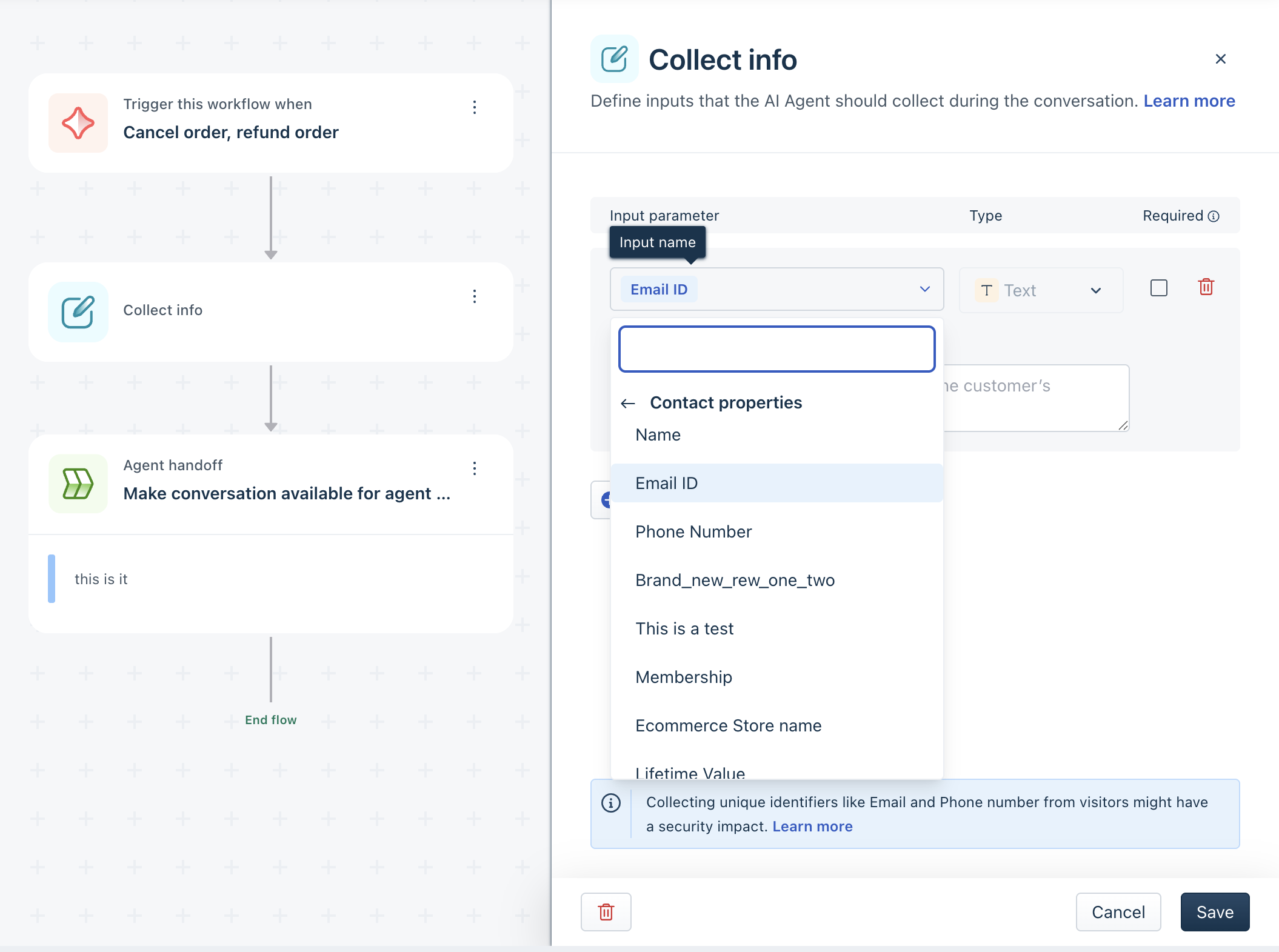 The collect info block allows you to gather specific information from the customer during an AI Agent conversation. The collected inputs can then be used to trigger API actions, evaluate conditions, update properties, or send personalized responses within the workflow.