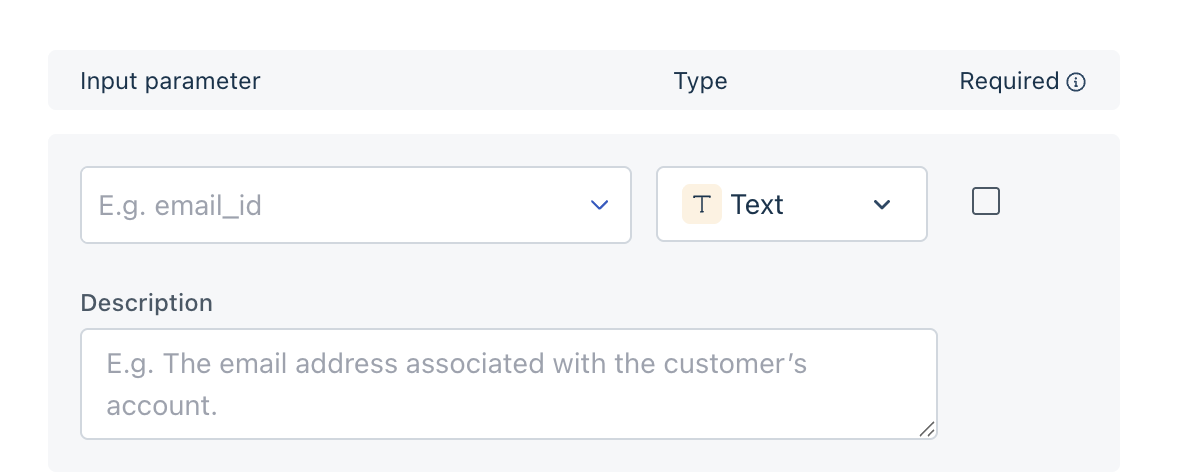 For each input collected, you can additionally define the data type, add a description, and decide if the input is mandatory or not.