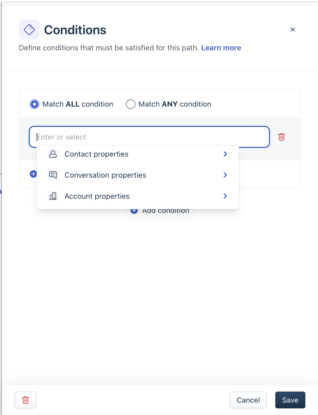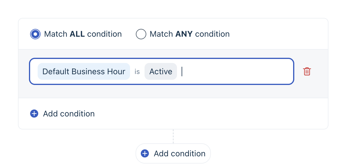 Note: The available operators vary based on the selected condition type. For example, Business Hours supports only Is and Is not, while text-based properties support additional comparison operators.