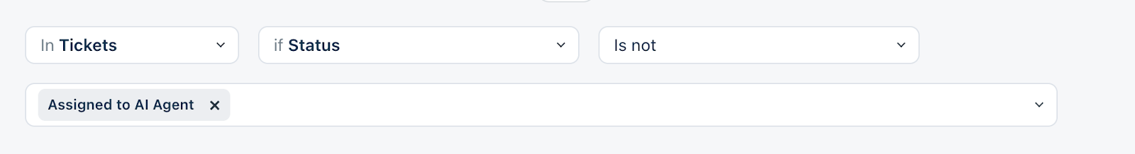 - Under Conditions > In Tickets > Status > Is not > Assigned to AI Agent