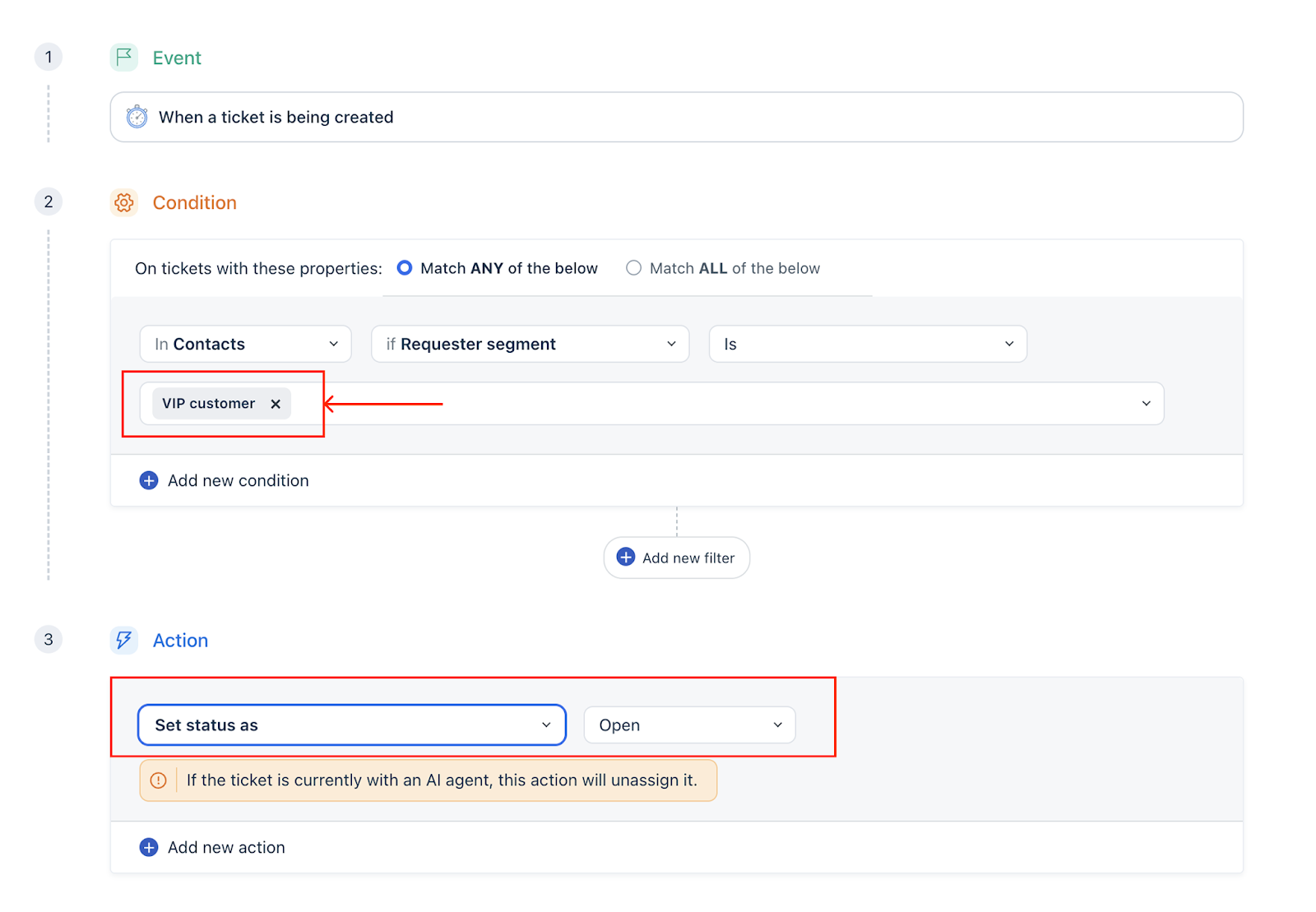 To prevent the AI Agent from responding to certain tickets (for example, VIP customers), set up a condition that includes a specific requester or customer segment. This condition should trigger an action, such as changing the ticket's status, that excludes the AI Agent from the response workflow.