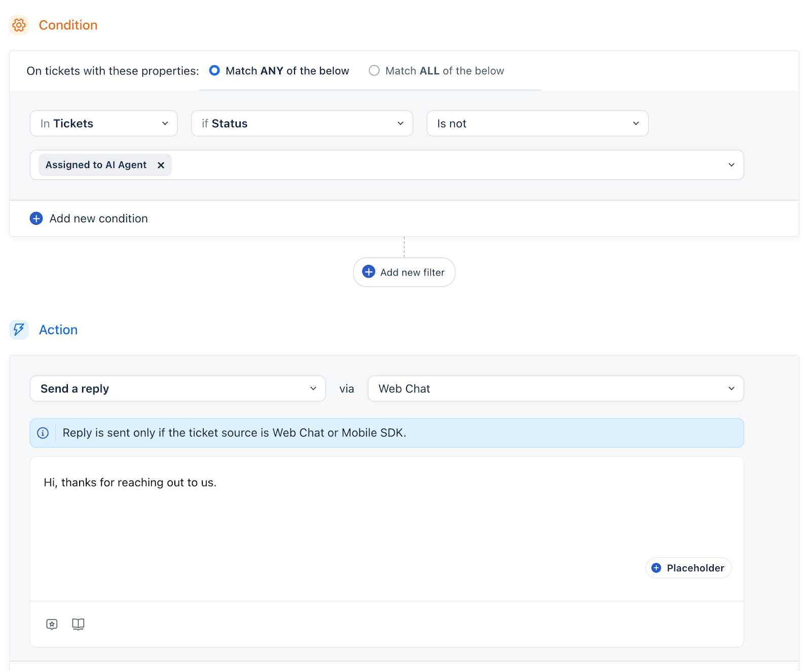 Set up an automation that checks whether a ticket is assigned to an AI Agent. If the ticket is not assigned to an AI Agent, automatically send a reply such as: “Hi, thanks for reaching out to us.”
