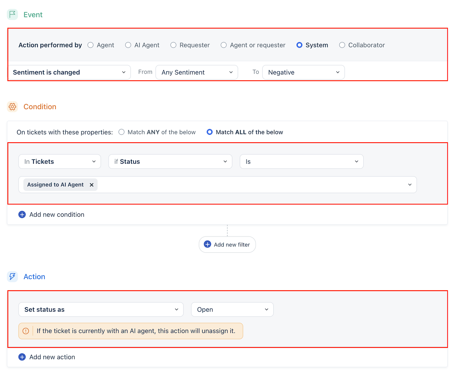 If customer sentiment turns negative during interaction with an AI Agent, configure ticket update automations to automatically set the ticket status to ‘Open’.