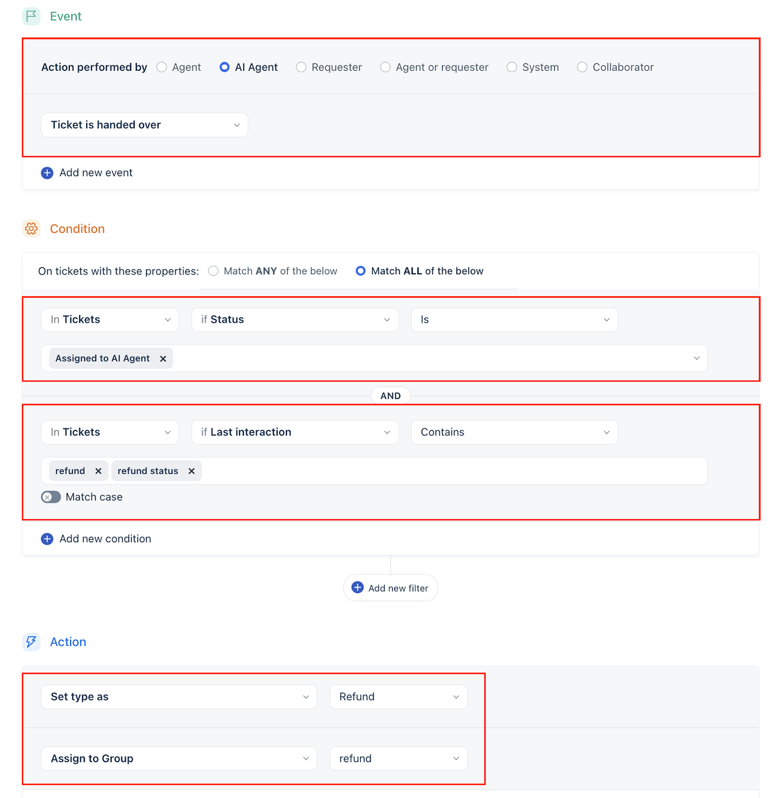 Clearly defining when AI Agent–specific automations should run, and when they should be excluded, enables better control over ticket workflows. This helps ensure predictable behavior and consistent execution across AI and human-handled tickets.